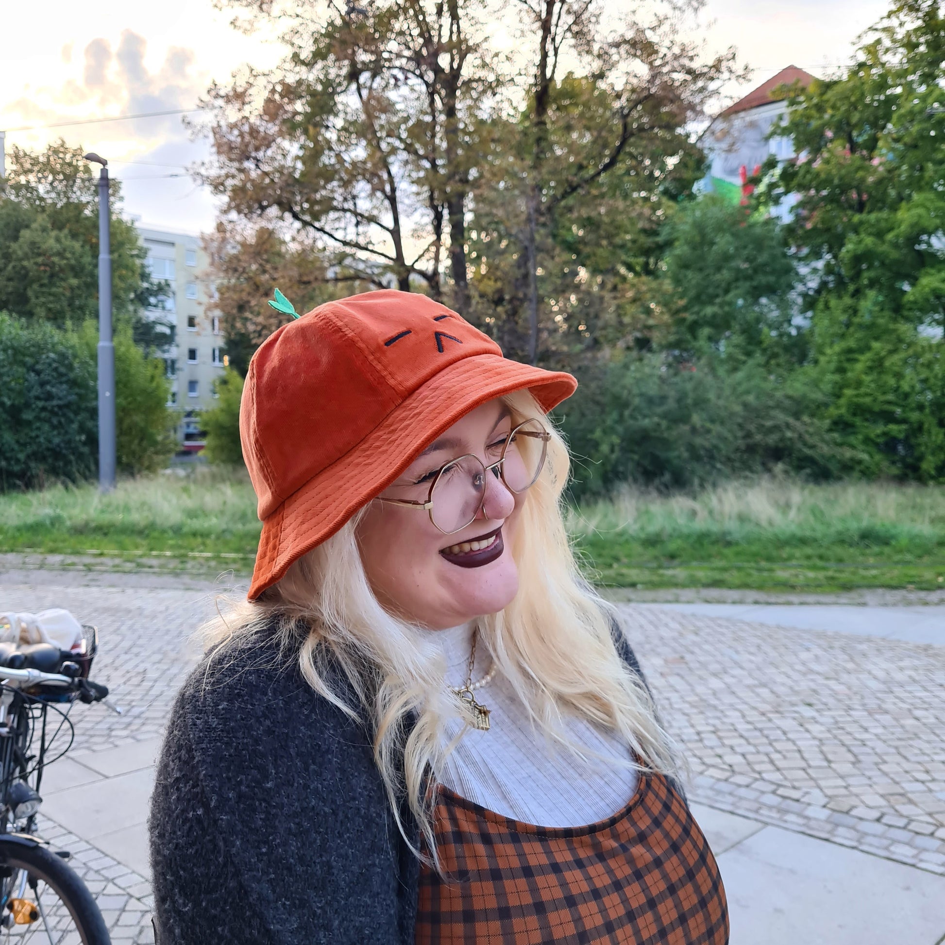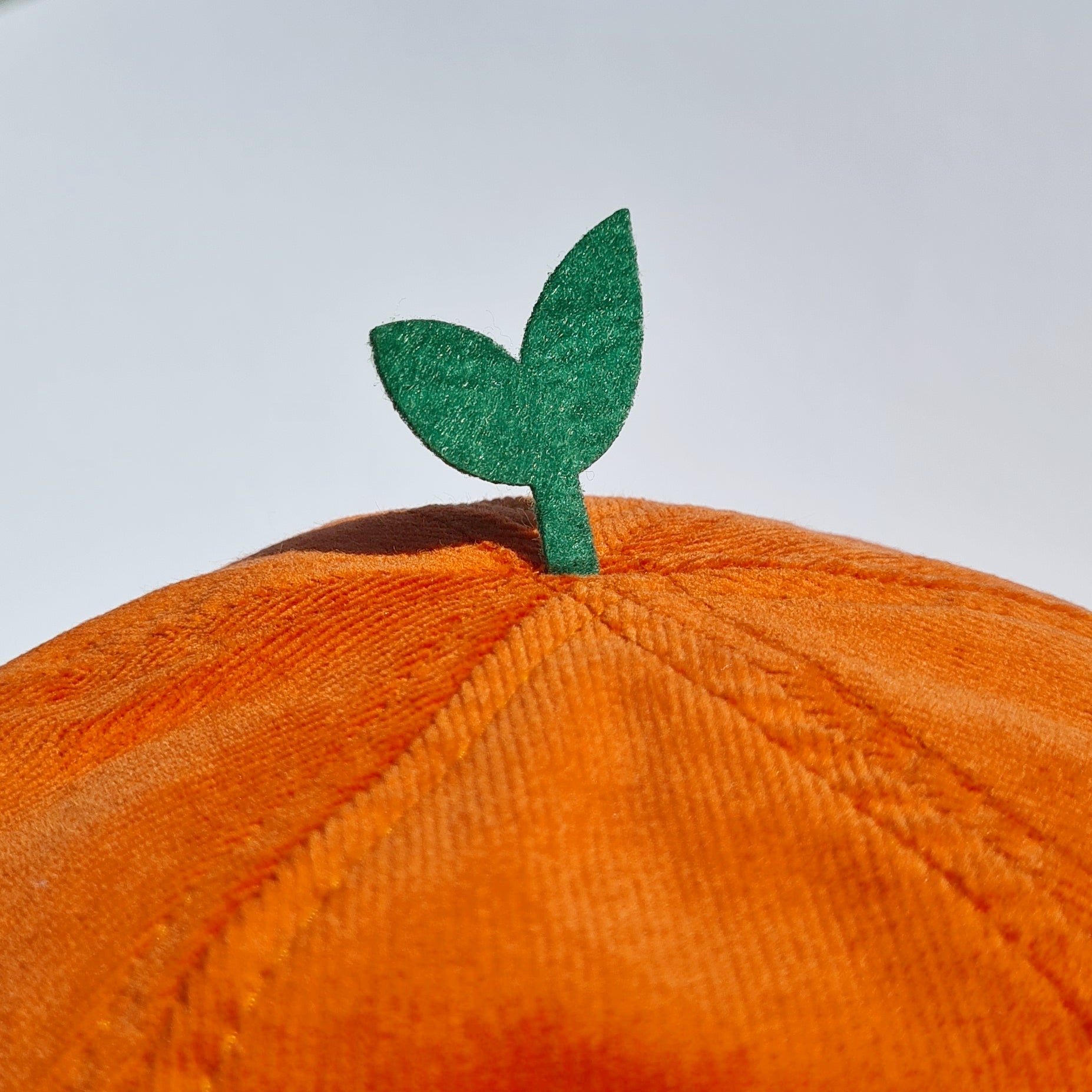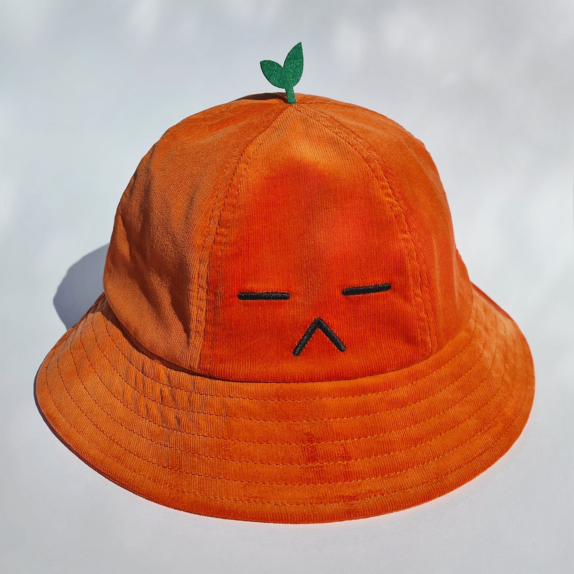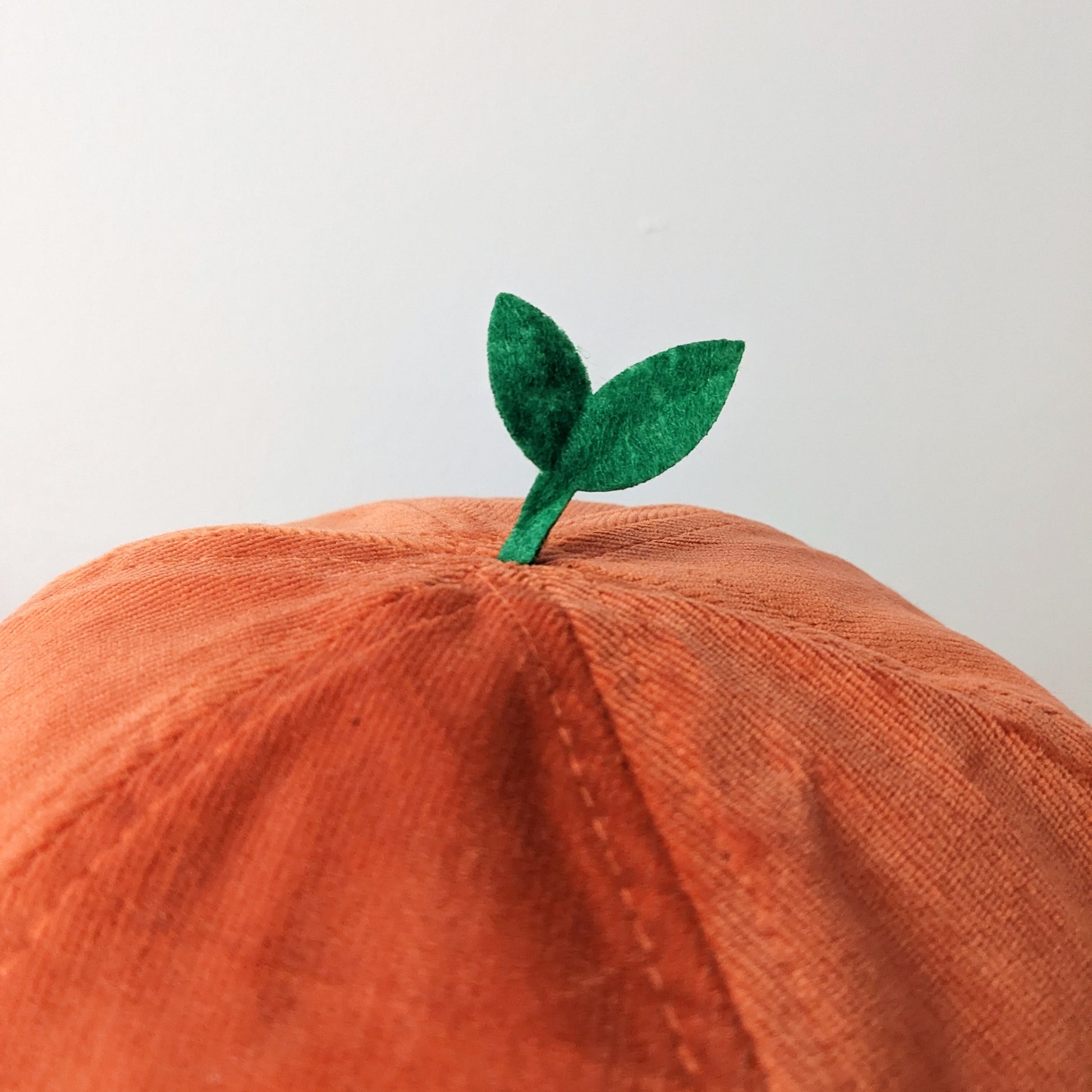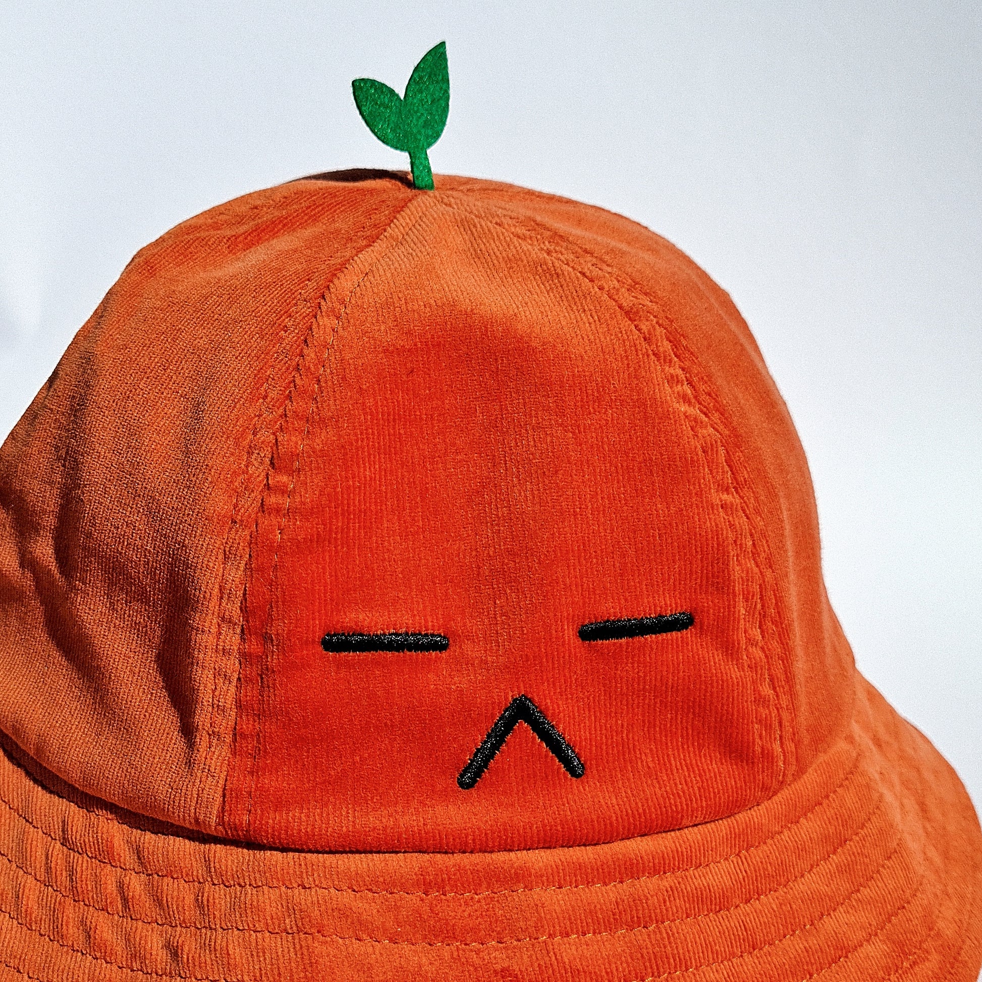- orange corduroy with black embroidery and felt sprout